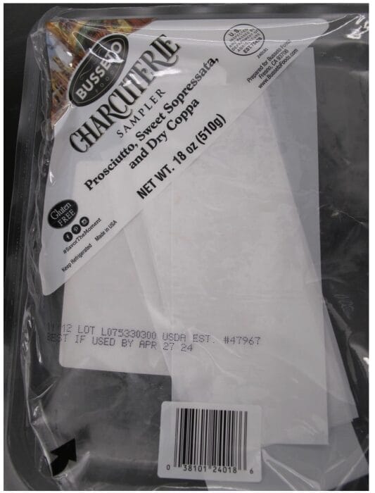 18-oz. plastic tray packages containing “BUSSETO FOODS CHARCUTERIE SAMPLER Prosciutto, Sweet Sopressata, and Dry Coppa” with lot code L075330300 and “BEST IF USED BY APR 27 24.”