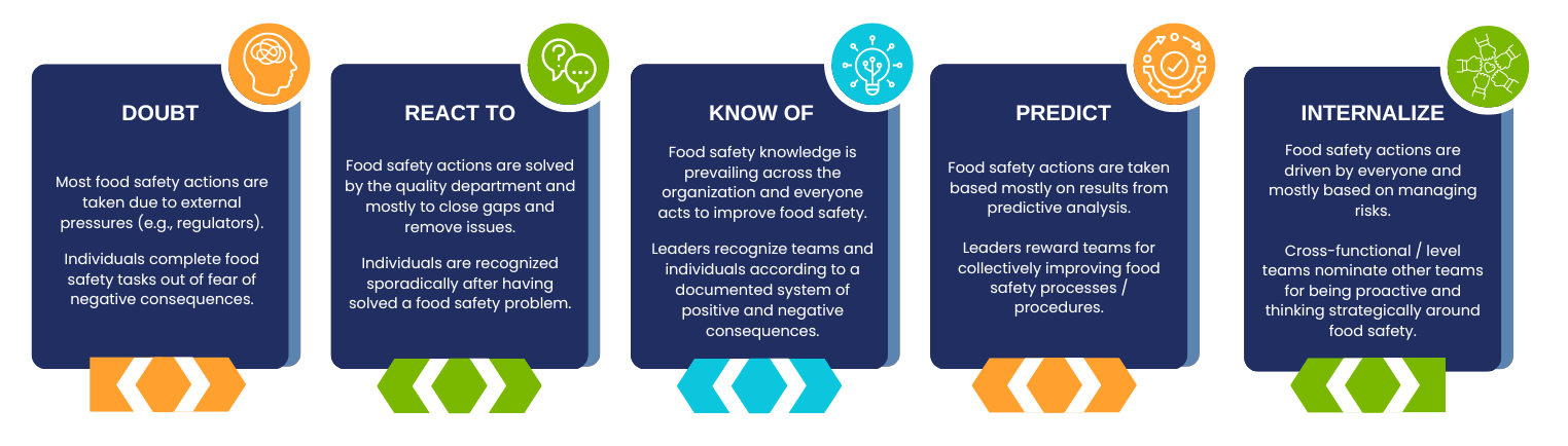 Define your vision for food safety culture at your organization. Consider beginning by evaluating where you are currently in your food safety culture journey through surveys, observations, or other methods of assessment. Models like the one below, can help identify behaviors and attitudes at different levels of food safety culture maturity (5). Once you know where you are starting, you can begin planning for where you wish to go.